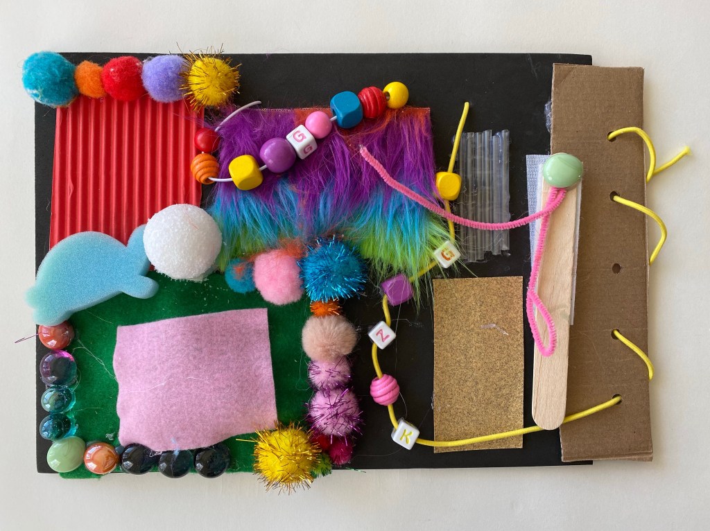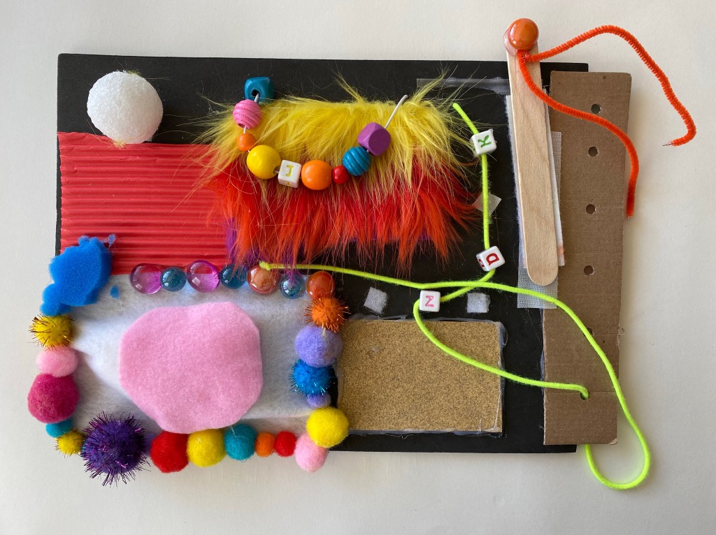 Materials used include: foam board, elastic thread, securely attached beads and bells, fabric, sand paper, corrugated paper, felt, Velcro, popsicle sticks, chenille sticks, Pom poms and more.